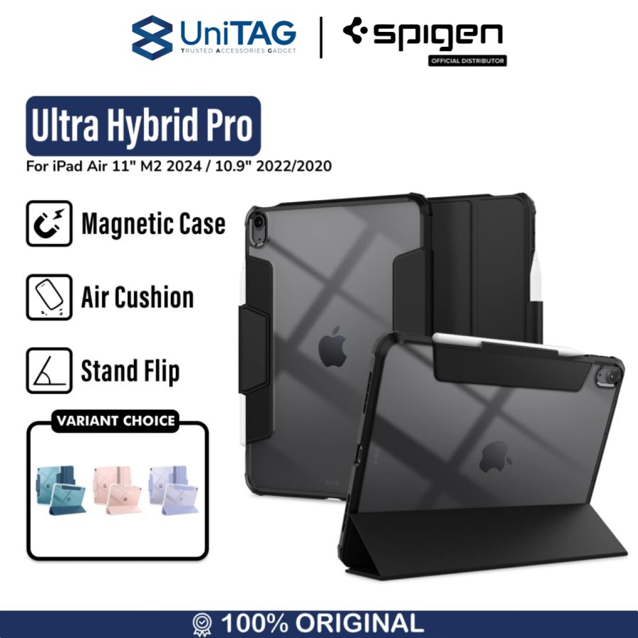 Case iPad Air 11 M2 (2024) / iPad Air 10.9 (2022 / 2020) Spigen Spigen Ultra Hybrid Pro merupakan stand flip cover Casing yang terbuat dari campuran bahan TPU (Softcase) pada bagian bumper, backplate terbuat dari bahan PC (Hardcase) yang clear dan dilapisi Leather pada bagian Flip cover yang memberikan kesan elegan untuk iPad kamu!