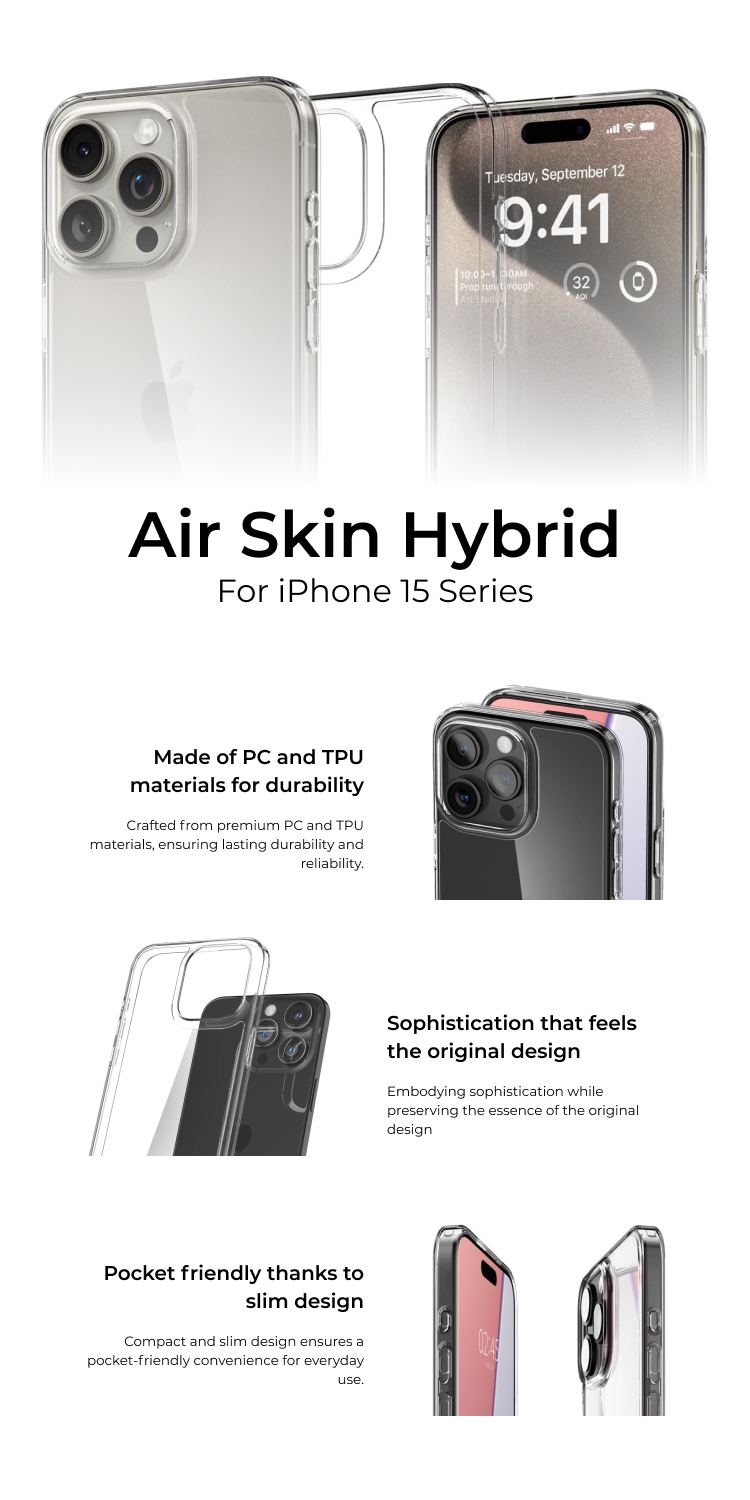 Case iPhone 15 Series Spigen Air Skin Hybrid Merupakan slim hybrid casing yang menggunakan bahan premium sehingga ringan dan nyaman saat digenggam. Casing ini terbuat dari campuran bahan TPU (Softcase) dan PC (Hardcase) premium yang nyaman