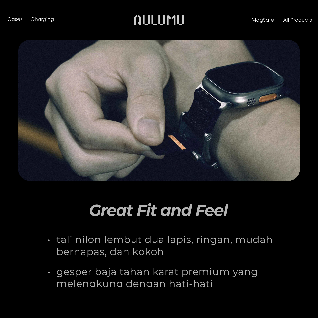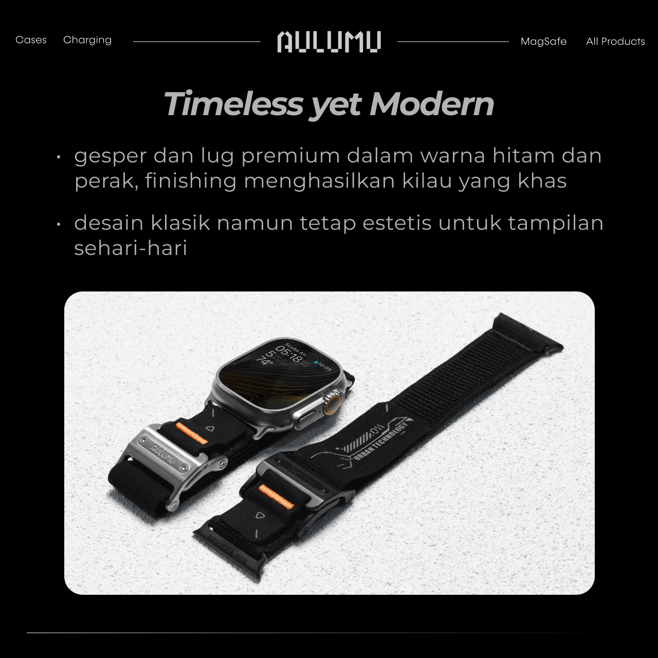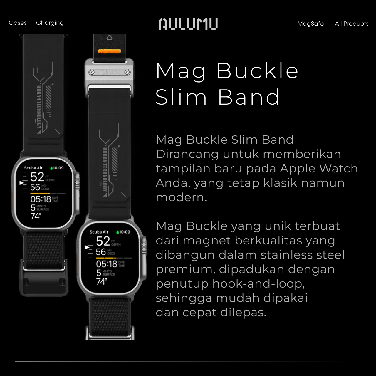Strap Apple Watch Ultra Series Ultra 49mm, Apple Watch Series 10 (46mm), Apple Watch Series 9, 8, 7 (45mm), Series 6, 5, 4 (44mm), SE (44mm), Series 3 (42mm) Aulumu Magnetic Buckle Slim Band Flexible merupakan strap yang memiliki gaya yang modern, Bagian bukle yang memiliki magnet kuat untuk mengunci sehingga sangat nyaman dan mudah digunakan setiap hari.