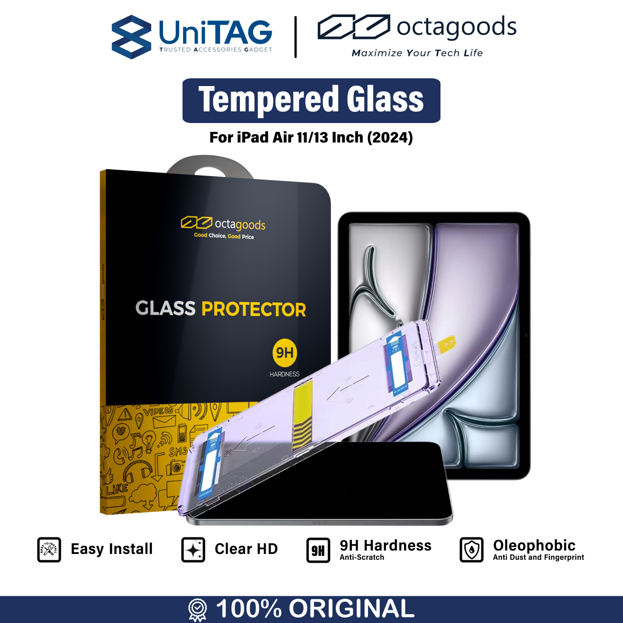 Tempered Glass Octagoods iPad air 11 inch / 13 inch M2 2024 menghadirkan ketahanan kaca 9H anti goresan serta dilengkapi dengan Tray untuk pemasangan yang presisi, bikin makin aman, makin mudah pasangnya!