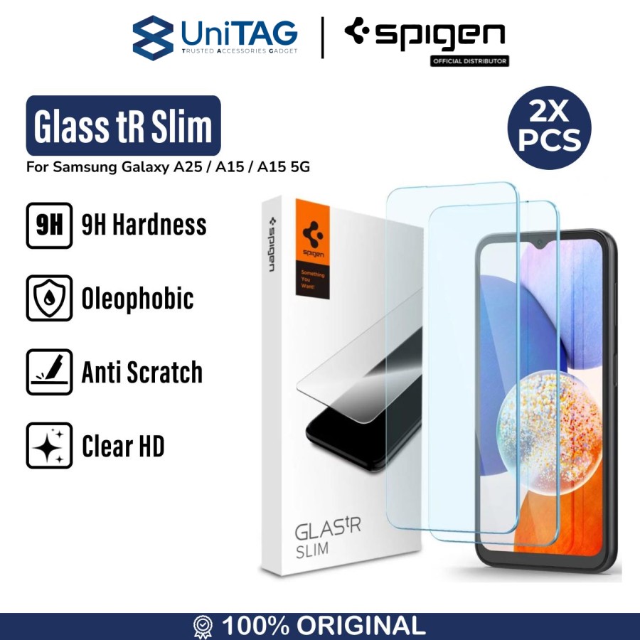 Tempered Glass Samsung Galaxy A25 / A15/ A15 5G Spigen Glas tR Slim terbuat dari premium glass dengan kekerasan 9H Hardness yang memiliki lapisan Oleophobic untuk melindungi dari goresan.