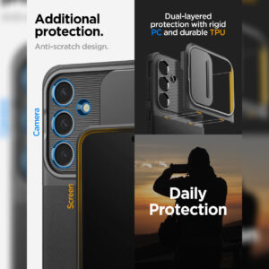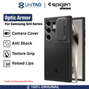 Case Samsung Galaxy S24 Series Spigen Optik Armor Merupakan Hybrid case yang memiliki kamera protector. Casing ini terbuat dari campuran bahan TPU (Softcase) pada bagian body dan bahan PC (Hardcase) pada bagian sliding frame camera.